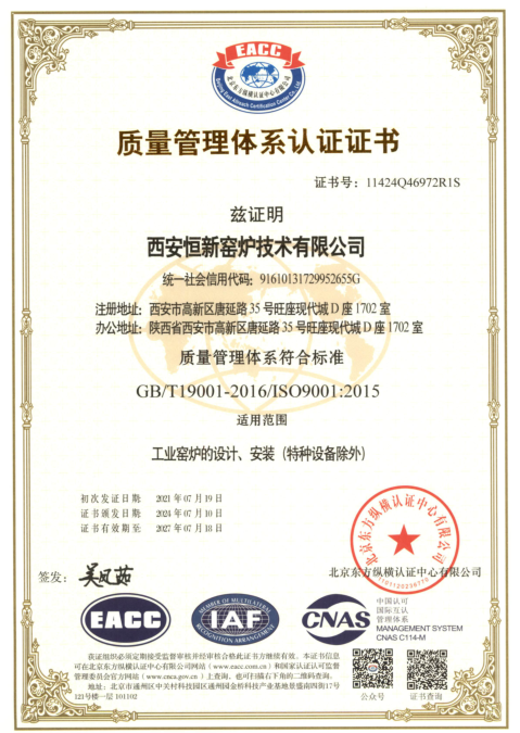 西安恒新窯爐技術(shù)有限公司于2024年7月初圓滿(mǎn)完成了ISO9001質(zhì)量認(rèn)證審核。審核期間,我公司認(rèn)真積極地配合專(zhuān)家審核,有問(wèn)題及時(shí)溝通探討,在雙方共同努力下,圓滿(mǎn)完成了質(zhì)量認(rèn)證審核。ISO9001質(zhì)量管理體系認(rèn)證,對(duì)公司的質(zhì)量管理水平有極大的提升作用,從而確保產(chǎn)品和服務(wù)的質(zhì)量。